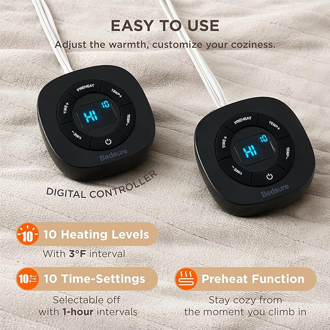 - Customizable Warmth: Featuring fast and consistent heating, this heated blanket queen size offers 10 heating levels and 10 time-settings for customizable coziness. Powered by advanced heating wire technology, it can precisely control temperature, ensuring safer warmth