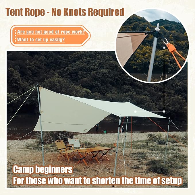 - ๐ณMake Camping Easier and Faster:Only need hook the hammock,tent tarp or tent stakes by the carabiners,then use the pulley to adjust the rope length for you need,reduce the set up time and eliminates time-consuming hitch knots;