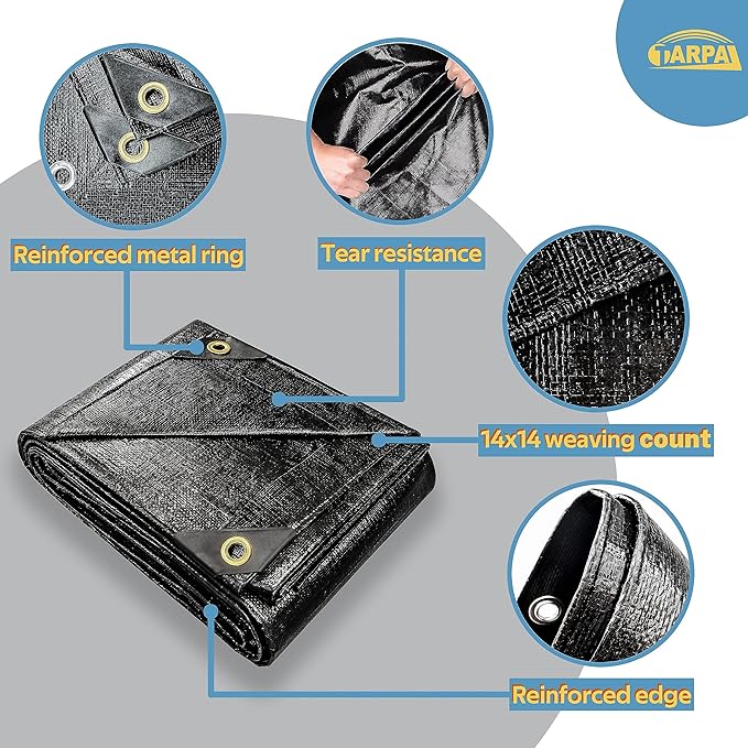 - 【14 Mil black tarp waterproof】Made of tightly woven polyethylene fibers, the surface is compact, fine, and smooth, with higher density and toughness, achieving tear and wear resistance. At the same time, the tarpaulin has been coated with double-sided thickened coating, which is multifunctional and tarps, doubling tarp heavy duty waterproof performance.