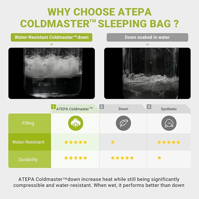 - PREMIUM COLD WEATHER DOWN SLEEPING BAG: Engineered for cold weather, this sleeping bag can keep you comfortable down to 39.2°F (4°C). It is filled with 600g Coldmaster down (70% down and 30% down alternative synthetic) for exceptional warmth, lightweight and breathability. The insulated design, combined with soft 20D nylon, chest collar, hood drawstring, Windproof strips, velcro, detachable hood and 3D baffle box construction, is designed to prevent cold spots, locks heat even on chilly nights