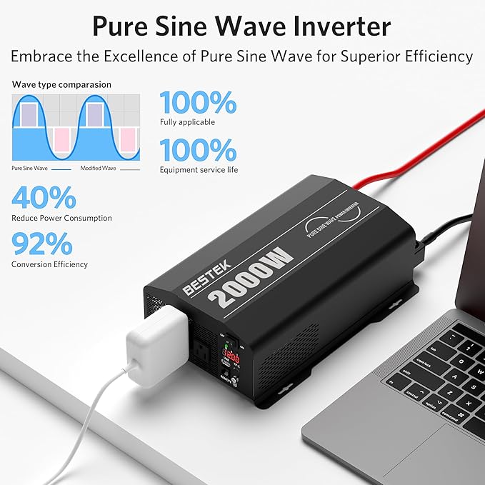 - [BESTEK Advantage]: America's leading power inverter brand. This Pure Sine Wave inverter Provides 2000 Watts continuous DC to AC power, 4000W peak of surge during The conversion efficiency of this power inverter is ≥92%, effectively converting 12V DC to 110V/120V AC power and reducing energy losses.