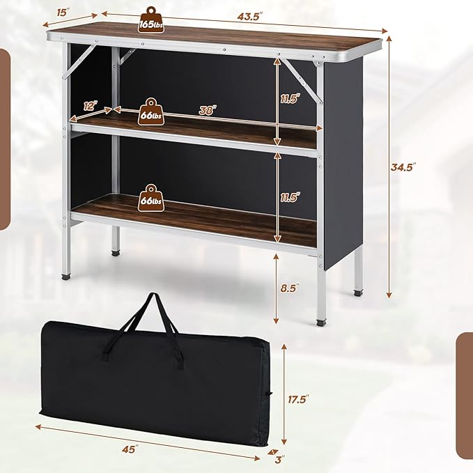 - Easy Assembly - This folding table features a swift, tool-free setup that allows you to assemble it in under a minute; Overall Dimensions: 43.5"(L) x 15"(W) x 34.5"(H); Table Weight Capacity: 165 lbs.; Shelf Weight Capacity: 66 lbs.
