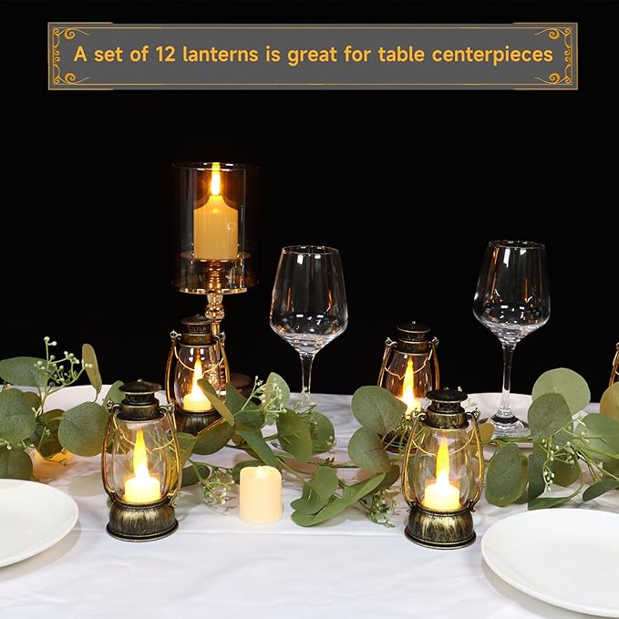 12Pcs Mini Lantern for Halloween Decor, 6Inch Small Lanterns for Western Garden Camping Party Decorations, Vintage Candleholders Table Centerpiece, Forest Christmas Wedding Decorations (Brass)