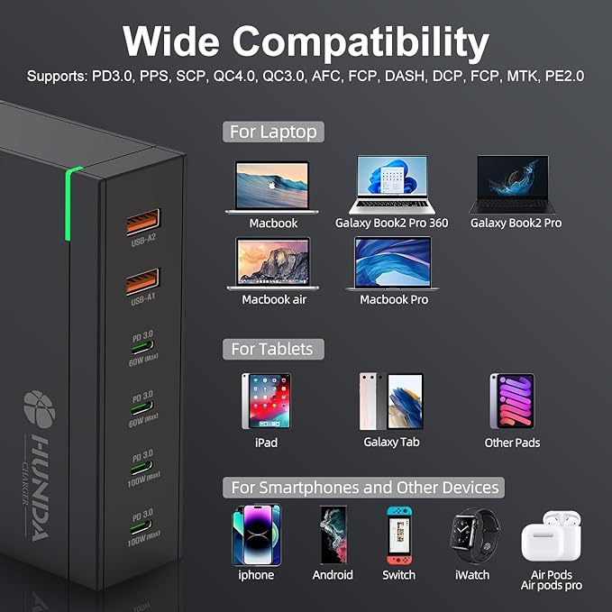 HUNDA 200W USB C Charger GaN Charging Station 6 Ports Fast PD 100W Type C MacBook Charger Desktop Adapter Support PD3.0 /PPS 45W /QC5 for MacBook Pro/Air, iPhone 15/14, Galaxy s24/s23,HP,Dell etc