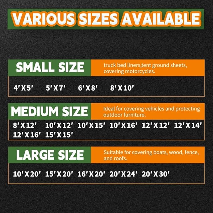 - 【FINISHED SIZE】The size of RAINDEWAY tarp is actual size that can be used, you will receive a full size tarp. This tarp can protect your roof, truck, car, tent, pet cages, boat, or outdoor furniture from rain, sand, dirt, and sunlight, You never know when a tarp will come in handy.