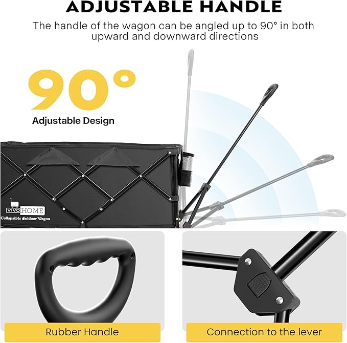- ADJUSTABLE HANDLE - The handle of the folding cart is adjustable and can be angled up to 90° in both upward and downward directions; With an extended handle up to a maximum length of 41.7 inches, the wagon can be easily maneuvered even when carrying heavy loads, ensuring a smooth and effortless pulling experience; The grip of the handle is ergonomically designed, which enhances the user's comfort and reduces the effort required when pulling the wagon