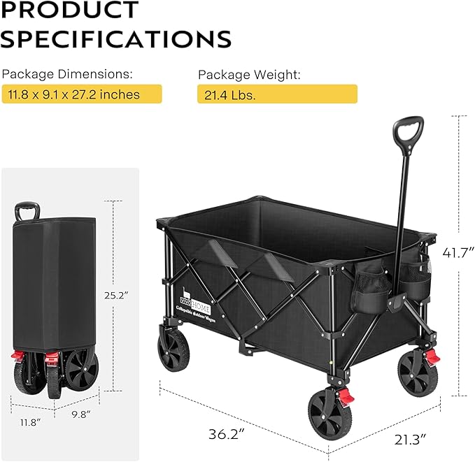- COLLAPSIBLE AND PORTABLE - With a weight of 19.6 lbs., this collapsible wagon is able to provide convenience for travel and transportation purposes; When you're finished using the cart, simply fold it up in seconds and place it in your trunk, garage, or closet without any hassle; This not only saves much space but also provides a convenient way to keep your cart out of the way when not in use