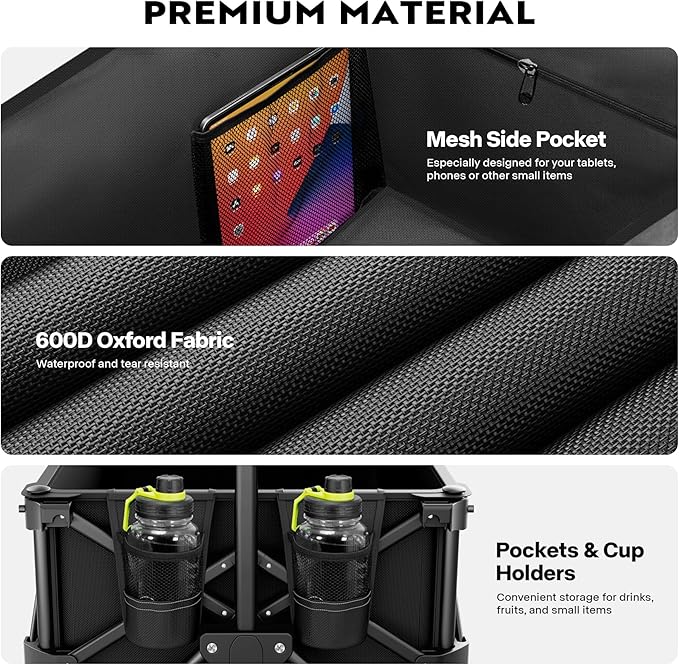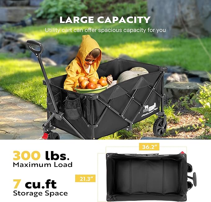 - PREMIUM MATERIAL - Made of 600D Oxford fabric with a PVC coating, the wagon cart is waterproof, tear-resistant, and durable; With a heavy-duty steel frame, it can support up to 300 lbs.; The cart features 4 universal wheels that can be easily adjusted to any angle while moving; Each of the front 2 wheels is equipped with a brake, providing extra stability when parking; This utility cart is a great option for anyone looking for a compact and reliable solution