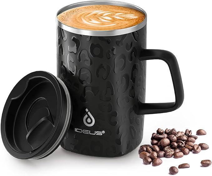 Ideus Vacuum Insulated Coffee Mug, 16oz Reusable Stainless Steel Thermal Double Walled cup with Handle and Slider Lid for Hot & Cold Beverages, BPA Free (Leapord Black)