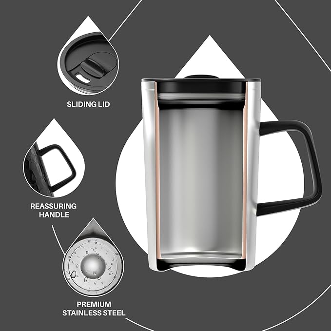 - Large Capacity - Our thermal beverage mug has an ample capacity of 16 Oz ( 470 ml ). Reduce the number of times you run to pour water.