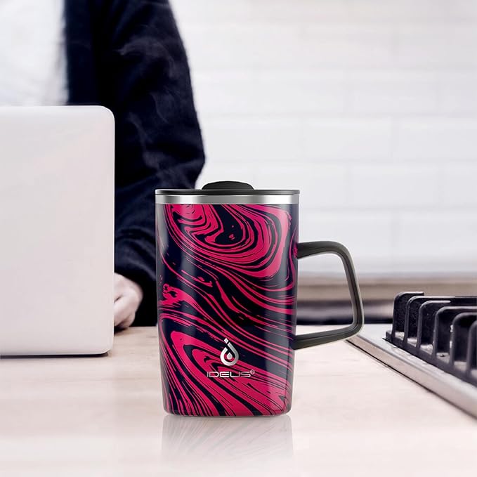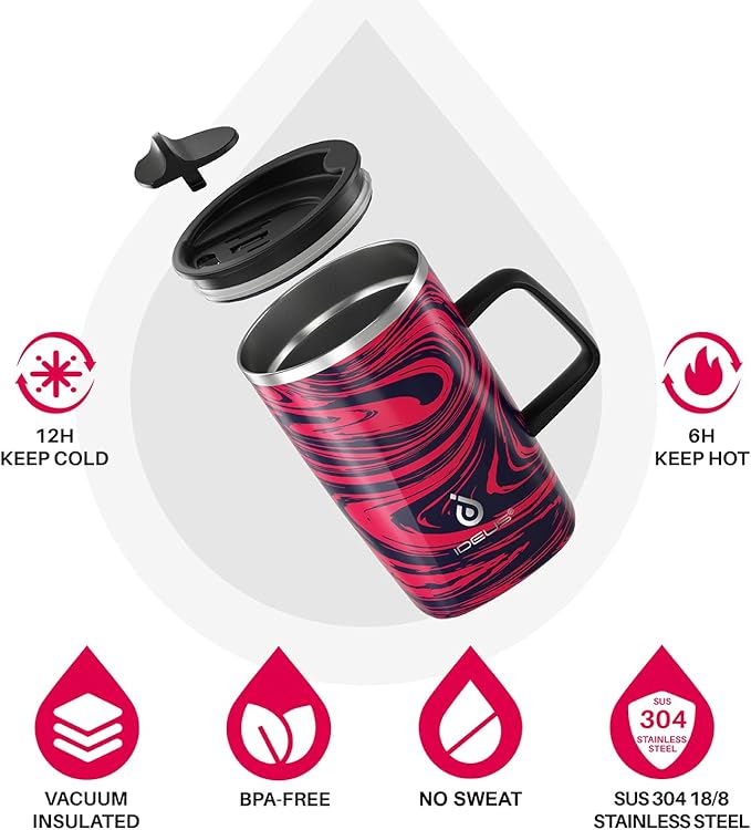 Ideus Vacuum Insulated Coffee Mug, 16oz Reusable Stainless Steel Thermal Double Walled cup with Handle and Slider Lid for Hot & Cold Beverages, BPA Free (Red Zebra)