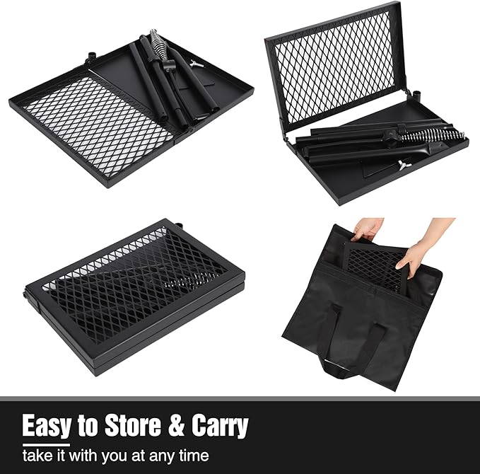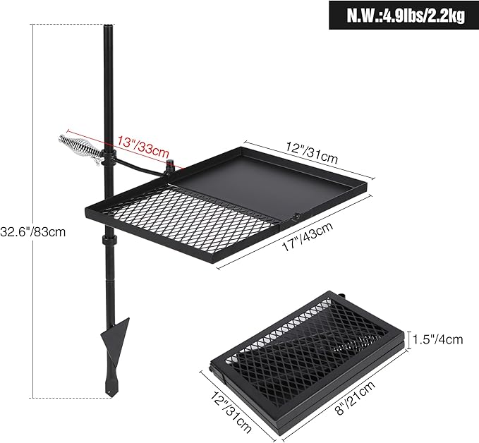 - Dimensions: The unfolded size of campfire grill is 17x12x32.6”/43x31x83cm. The package size is 12x8x1.5”/31x21x4cm. N.W.: 4.9lbs/2.2kg