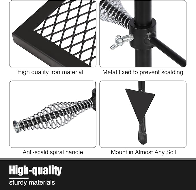 - Adjustable Height: The pole of the barbecue campfire grill consists of 4 poles. You can freely adjust the height. When grilling, please insert the steel base rod into the soil, the triangle is in the same direction as the grill.