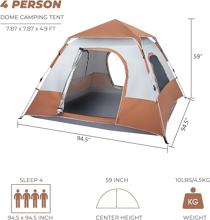 4 Person Instant Pop Up Tents for Camping, Waterproof Easy Set Up Large Family Dome Tent with Portable Carry Bag, 94.49 x 94.49 x 59.06 Inches