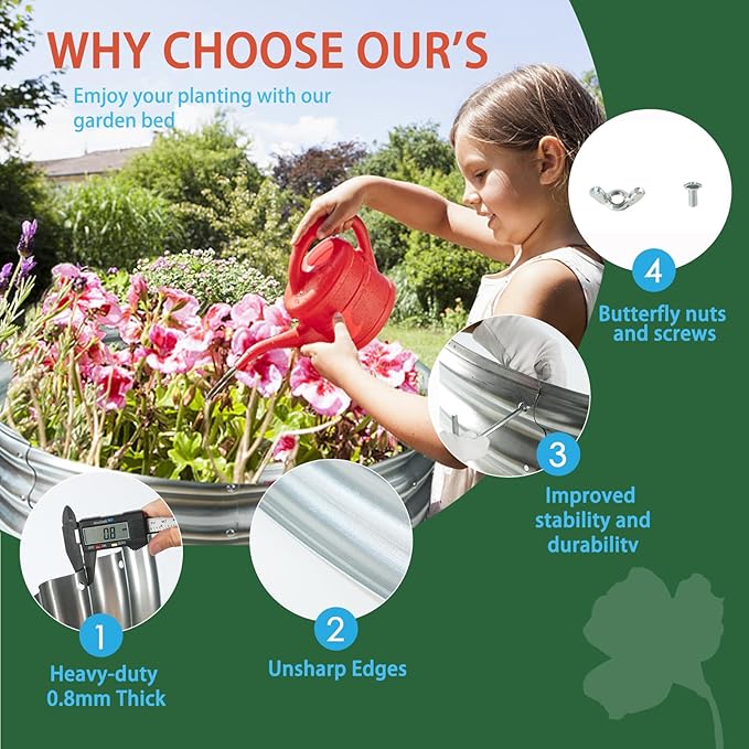 - 【EASY ASSEMBLY】: This galvanized steel raised garden bed only takes about 5 minutes to assemble easily,a screwdriver and a pair of gloves are need,which are prepared in the package already