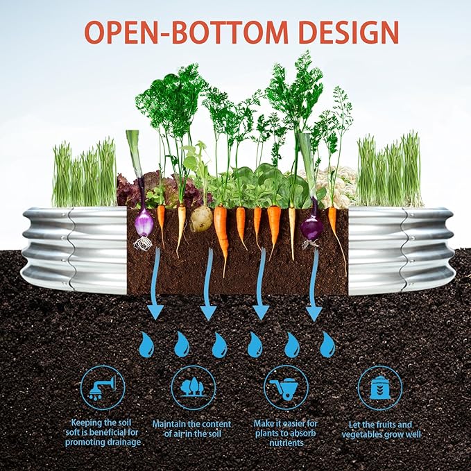 - 【OPEN BOTTOM】: This galvanized raised garden beds have open bottom design,which promotes healthy drainage and allows for deeper root growth, ensuring your plants thrive