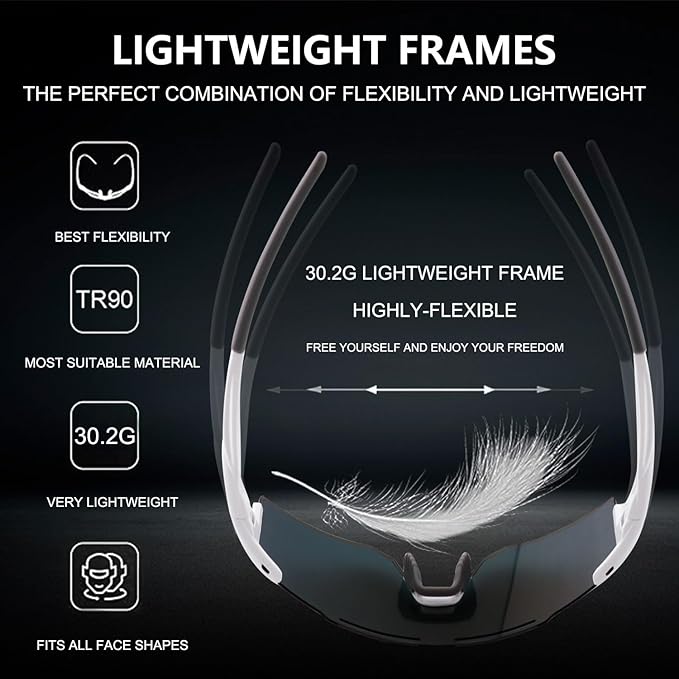 - LIGHTWEIGHT DESIGN:Our sports sunglasses made of durable and strong frame and uv protection lens lightweight design,weighs only 25 g that you can’t feel you was wearing it;The frame can bend under pressure and contour your face comfortably;Ideal for usage by motorcycle ,cycling, driving, running, baseball,fishing, racing, golf and climbing, trekking or other outdoor activities
