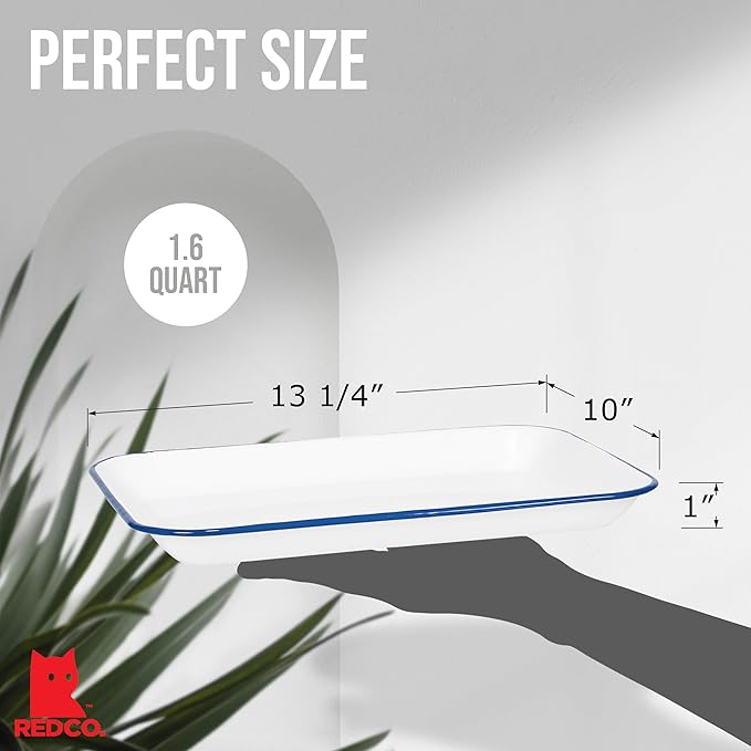 Red Co. 13.5” x 10” Enamelware Metal Classic 1.6-Quart Rectangular Serving Tray, Solid White/Navy Blue Rim