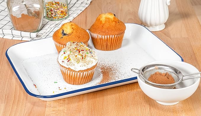 - Features a rectangular shape with a smooth, enameled white surface, and blue rim to perfectly complement vintage, shabby chic, antique, cottage, farmhouse, and country living décor