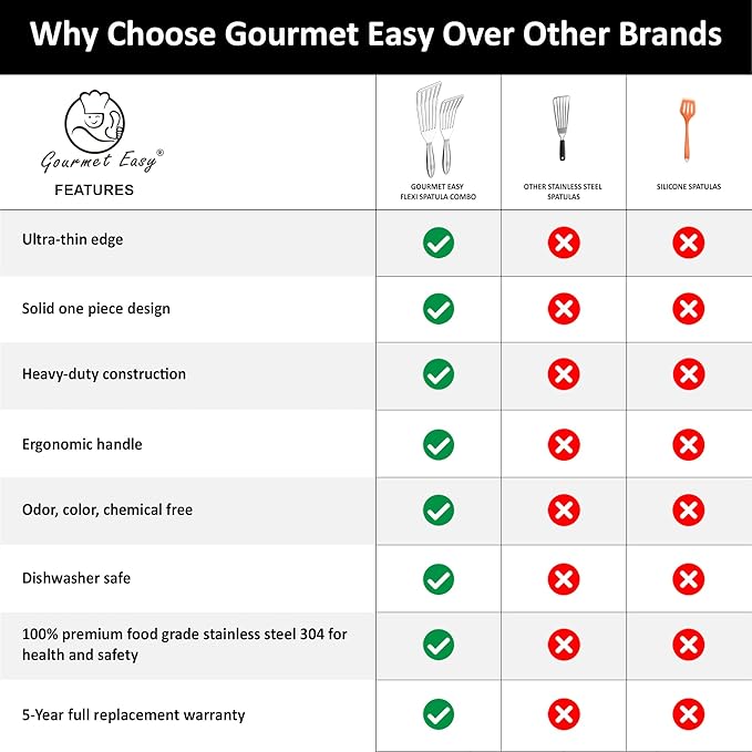 - ERGONOMIC HANDLE – ULTIMATE CONTROL - This stainless steel spatula set features an ergonomic, non-slip handle for a firm grip, even with wet hands. Whether you're flipping eggs or sautéing, it offers all time comfort and control.