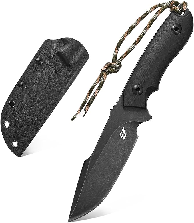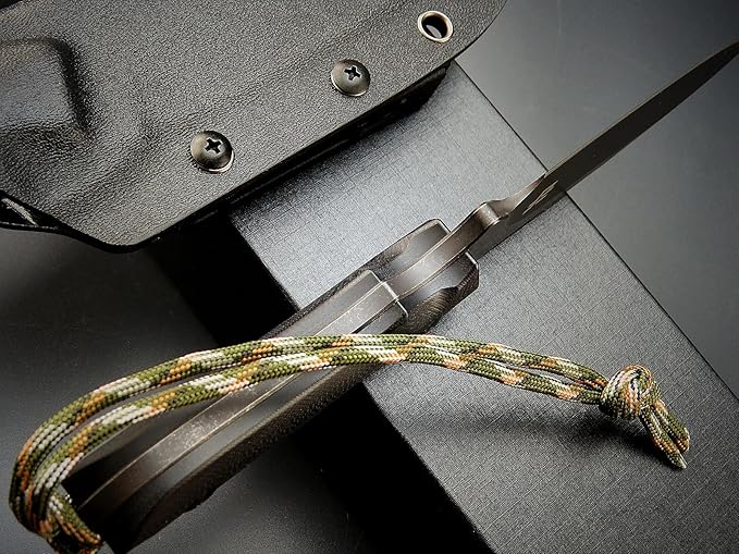 - High Durability DC53 Steel Blade: Blade made of DC53 stainless steel,hardness 60-62HRC ,using a black stone wash process, this sharp blade is sturdy built to last, provides razor sharp for ultimate precision cutting performance and excellent edge retention.with grossive jimping and a groove Cutting on the back of the blade,plus a finger guard and finger choil , make sure a safety using and effortless cutting and puncturing works.