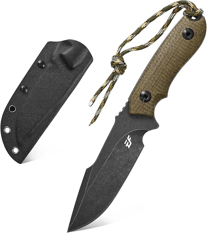 - Comfortable Fit Micarta Handle:Ergonomical design handle shape and nice thick full tang, provides a great balance and comfortable ergonomics, the Micarta scales are shaped for good grip comfort and the steel surrounding the scales is rounded for comfort, there isn't any sharp edge and rough corner.A lanyard hole on the end with a knife rope put through , for convenient versatile carry and Emergency window breaking.