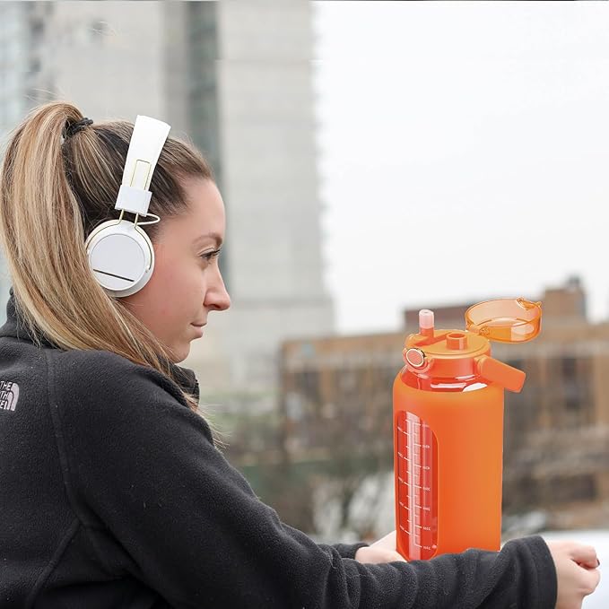 - Glass Water Bottle 64oz :The water jug with straw is designed with high-quality silicone sleeve to protect water bottle from slight bumps. In order to make the half-gallon(2 liters) big gym motivational water bottle easy to carry we have equipped it with handle. Wide-mouth opening make it easy to fill with ice cubes & fruits and daily clean