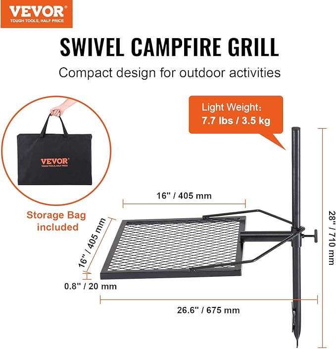 - Detachable & Portable: This swivel campfire grill boasts a detachable design and comes with a storage bag that is both wearable and beautiful to carry and protect the grill, making it easy to transport anywhere. Net Weight: 7.7 lbs / 3.5 kg.