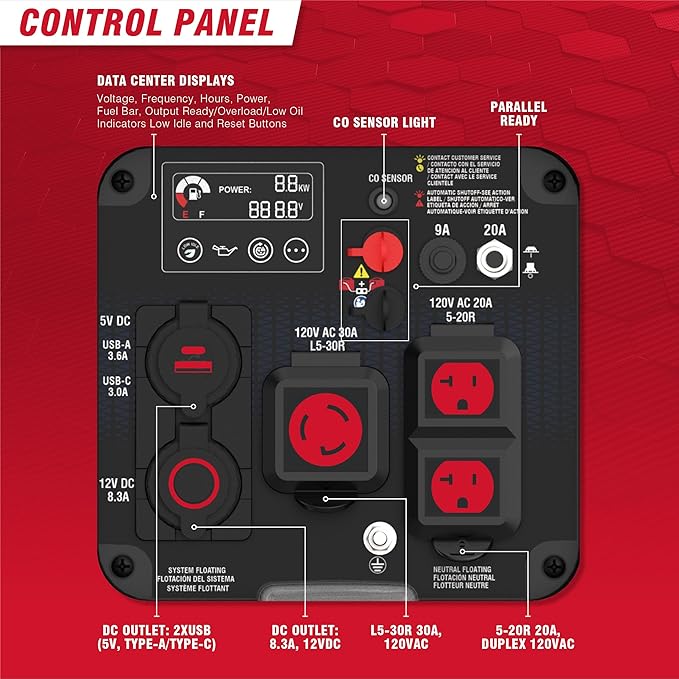 - Multi-Featured Control Panel: The control panel consists of CO sensor indicator light, led light, data center display, 1x L5-30R 30A 120V, 1x Duplex 5-20R 20A 120V, 1x 8.3A 12VDC, 1x USB-A 3.6A, 1x USB-C 3.0A