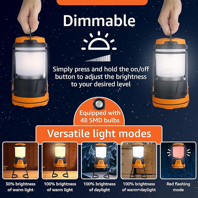 - Versatile Lighting Modes: This lantern lamp offers five lighting modes: daylight, warm light, a combination of both, and a red flashing mode. Except for the flashing mode, all other modes are dimmable, allowing you to adjust the brightness to your preference with a simple press and hold of the ON/OFF switch.