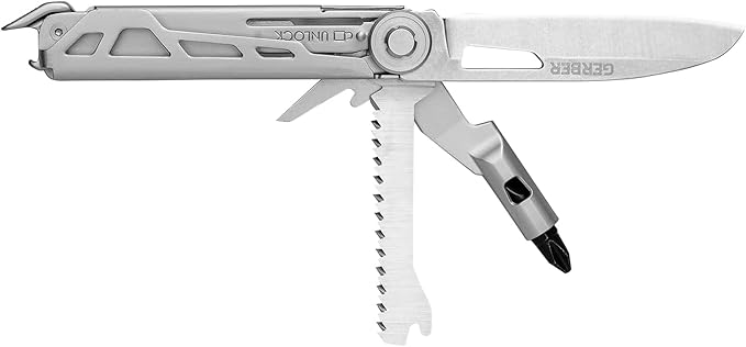 - 8-IN-1 MULTI-TOOL: Features a plain edge blade with frame lock, 2-sided 1/4" bit driver, pry bar, hammer, awl, saw, bottle opener, and pocket clip