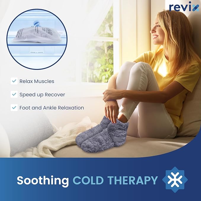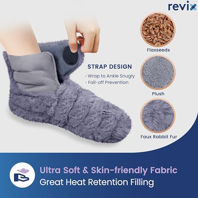 - Effective Relaxation for Foot and Ankle: The REVIX Microwavable Booties is a good choice for you. Warmed in microwave, the heated feet warmers ease muscle discomfort. You can also use it to help relax muscles, improve circulation and flexibility. It's also a good feet warmers for bed to help fall asleep with cold feet