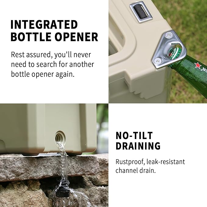 - QUALITY MATERIALS: Crafted with seamless LLDPE using rotomolding technology, our coolers feature UV-resistant exteriors and food-safe interiors. The impact-resistant, one-piece design withstands extreme outdoor abuse while maintaining structural integrity - no cracks, leaks, or warping under 310+ lbs weight capacity.