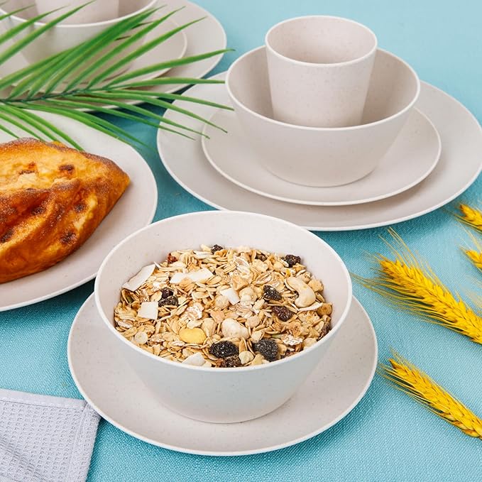 - REUSABLE AND STACKABLE:The unbreakable dinnerware sets are reusable,non-breakable,and designed with space-saving style and smooth round edges, our wheat straw plates are stackable, Stacking keeps your countertop without any mess.