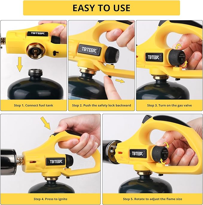 - TBTEEK Latest Upgraded Propane Cooking Torch: Safety is the first key point while cooking. After taking thousands of customers suggestions into consideration, we added a new design when developing this torch lighter-safety lock to prevent from incidental ignition. Besides, the unique ring-shaped hand guard protects your fingers from being burnt. So that you can mange your cooking with TBTEEK handheld propane torch freely.