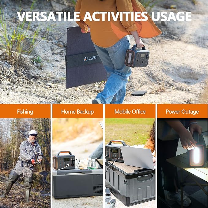 - 【Package Included】1x ALLWEI 300W Portable Power Station, 1x ALLWEI 100W Solar Panel built-in 5521 MM, 1x AC Power Adapter, 1x AC Cable, 1x DC Car Cable, 1x User Manual.