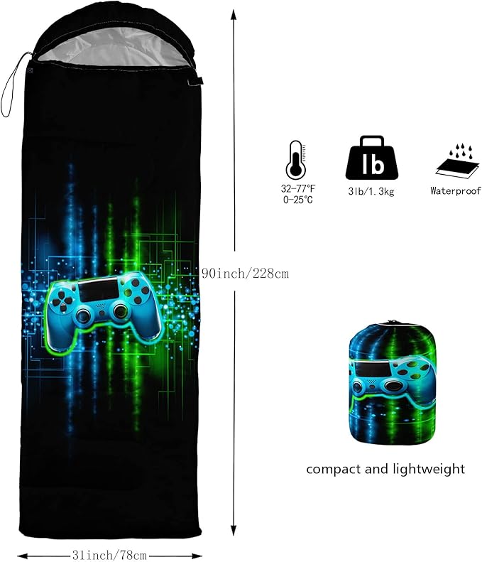 - SUITABLE:The sleeping bag can be used for 3 Seasons.SIZE:90.5"L x 31.5"W Suggenal extreme temperature: 41 ℉ -77 ℉.Applicable in a variety of scenarios,such as Travel camping pajamas party,It's very suitable for you to travel with your children.Half-circle hood with adjustable drawstring,which can keep you warm and prevent your humidity