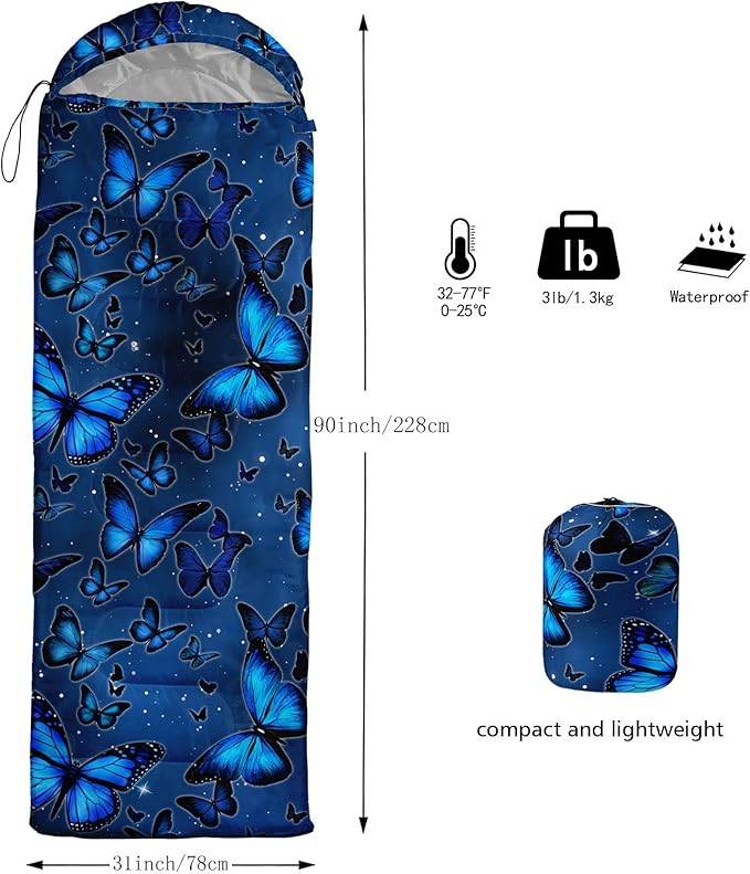 - SUITABLE:The sleeping bag can be used for 3 Seasons.SIZE:90.5"L x 31.5"W Suggenal extreme temperature: 41 ℉ -77 ℉.Applicable in a variety of scenarios,such as Travel camping pajamas party,It's very suitable for you to travel with your children.Half-circle hood with adjustable drawstring,which can keep you warm and prevent your humidity