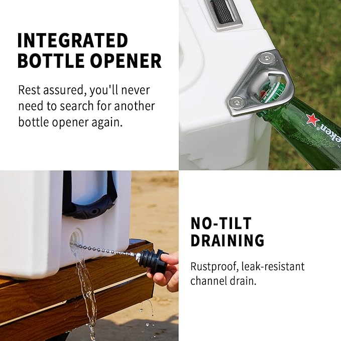 - QUALITY MATERIALS: Crafted with seamless LLDPE using rotomolding technology, our coolers feature UV-resistant exteriors and food-safe interiors. The impact-resistant, one-piece design withstands extreme outdoor abuse while maintaining structural integrity - no cracks, leaks, or warping under 310+ lbs weight capacity.