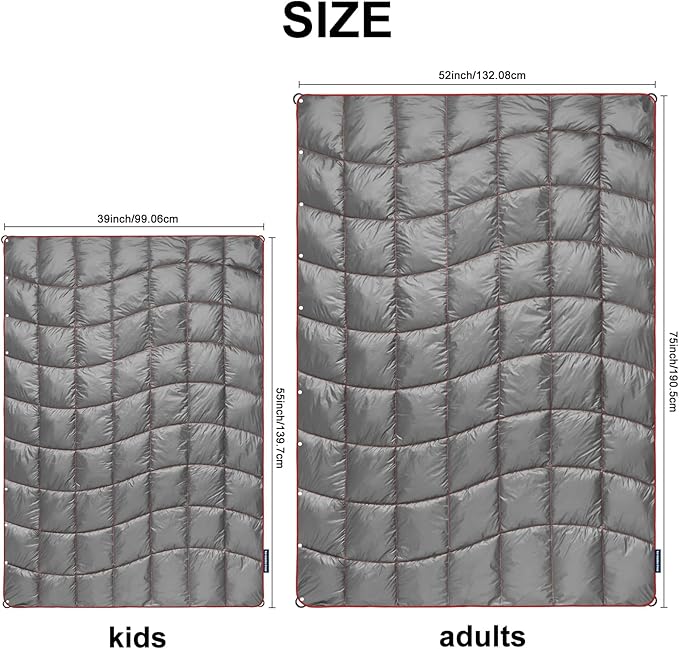 - Durable and Water-Resistant Blanket:The outer shell of this outdoor blanket is made of 20D rip-resistant nylon,With an upgraded coating with water repellency, dust and sand resistance, and pet hair.Stains are easy to wipe off, just wipe with a damp towel.It also locks in mildness against the cold, keeping you warm even in the cold wilderness.