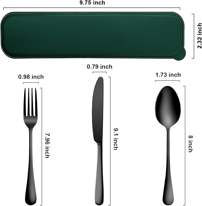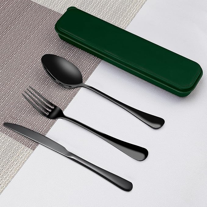 - Portable Cutlery Set with Case: 3 pieces reusable cutlery set with case, consist of 1 Dinner Forks+1 Dinner Spoons+ 1 Steak Knives+1 portable carrying case