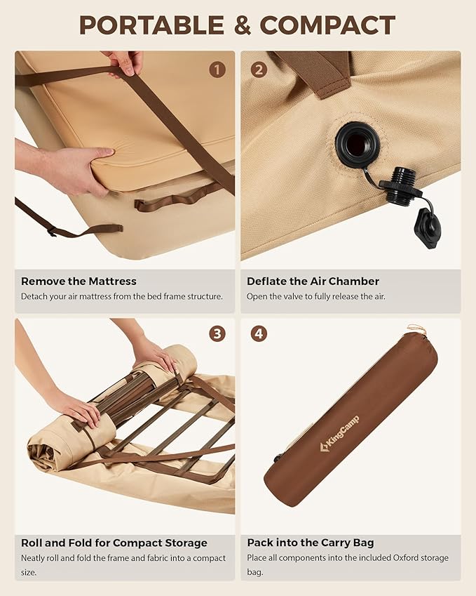 - Portable & Easy To Pack: Designed with portability in mind, this camping bed folds compactly and comes with a durable Oxford fabric shoulder bag for easy transport. Elastic compression straps make packing a breeze, while the dual-function Boston valve ensures fast inflation and deflation.