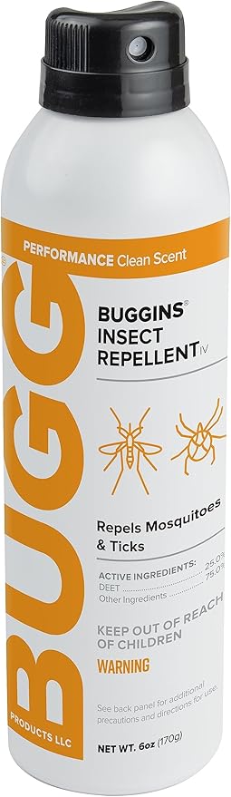 BUGGINS IV Performance - Insect Repellent - Mosquitoes, Gnats, Ticks, and Biting Flies, 25% DEET, Powdery Scent - 6 oz Continuous Spray Can