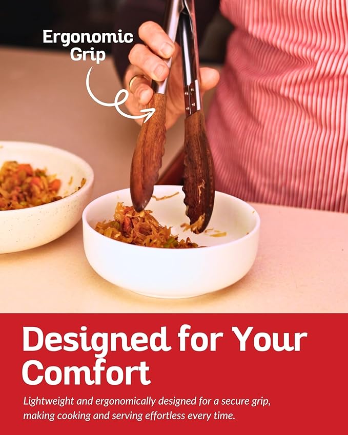- NON-TOXIC NATURAL WALNUT WOOD: This wooden tong for cooking is expertly crafted from natural walnut wood, ensuring a non-toxic and safe experience. This serving tong is reinforced with stainless steel, offering the durability needed for all your cooking tong needs.