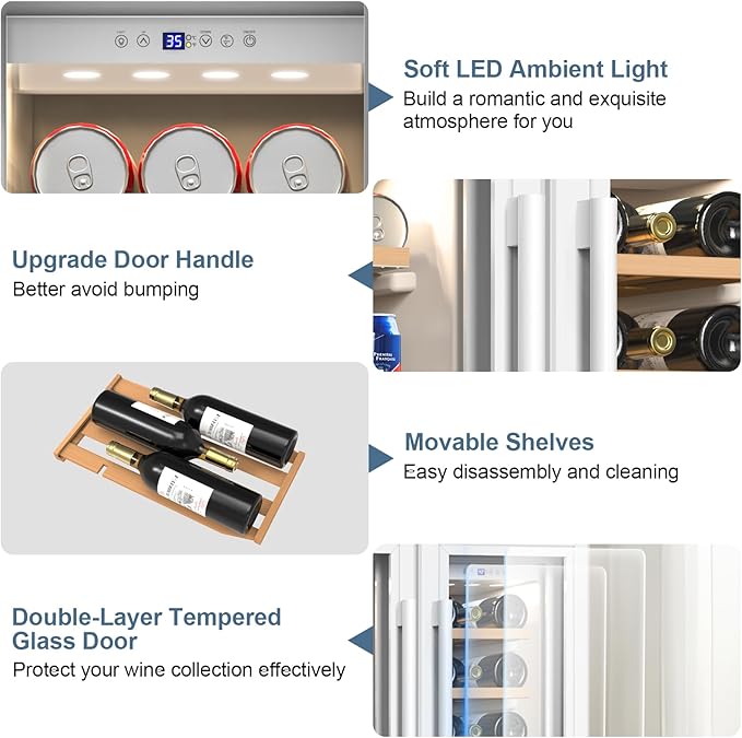 - Elegant & Modern Appearance: The white wine and beverage refrigerator seamlessly blends with your home decor, offering simplicity and elegance. The warm white LED lighting inside not only illuminates but also enhances the ambiance
