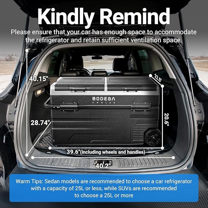 - APP CONTROL & VOLTAGE PROTECTION:Upgraded WiFi connection car refrigerator. BODEGACOOLER car fridge with APP control, you can control the freezer from distance or in car.Intelligent temperature control function to meet the required temperature of various ingredients. H/M/L 3-level low-voltage protection:When the measured DC voltage falls below the cut-off value, the compressor will off to prevent the vehicle from running out of power