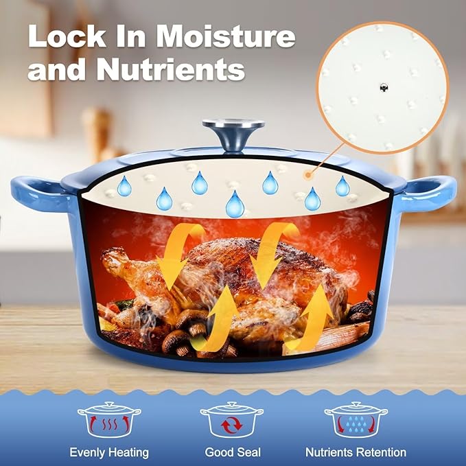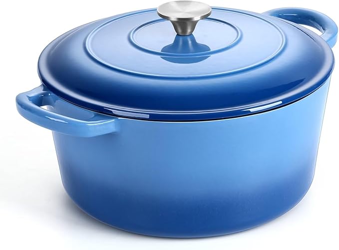 - 【CONSIDERATE DESIGNS】Our cast Iron dutch oven comes with thickened EPE foam & carton double packing, Protect your dutch oven roundly in delivery, Ergonomic lid handle provides comfortable holding, Wide sturdy one-piece handles ensure a firm grasp, No worries about handles falling apart, Beautiful blue color will decor your kitchen