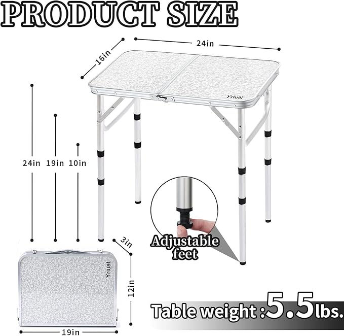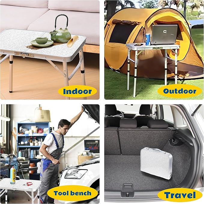 - Adjustable Heights:This small portable table open size is :24 "x 16 ", Adjustable legs offer 3 heights: 10 ", 19 ", 24 ". Folded size is 16 "x12 "x3 " when folded in half. Easily adapt the table to your needs and enjoy the flexibility it provides