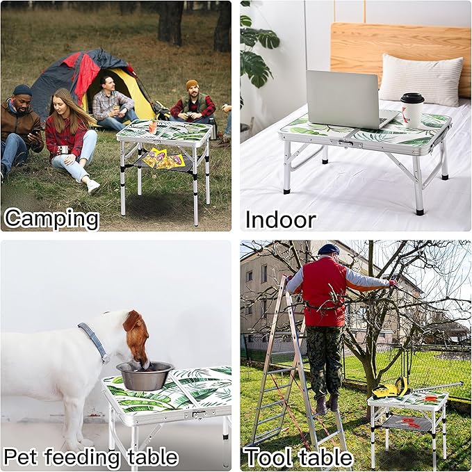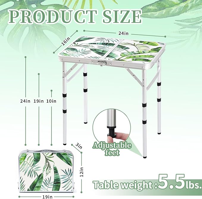 Folding Camping Table 2ft Portable Pinic Table Adjustable Height Small Card Table Aluminum Foldable Lightweight with Carry Handle for Outdoor Indoor Hiking Camp BBQ Beach (Monstera Palm Leaves)