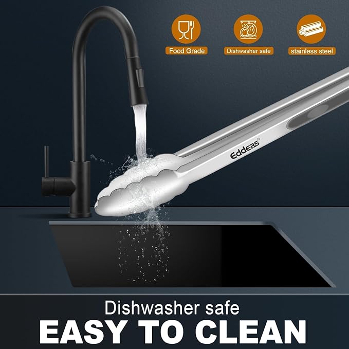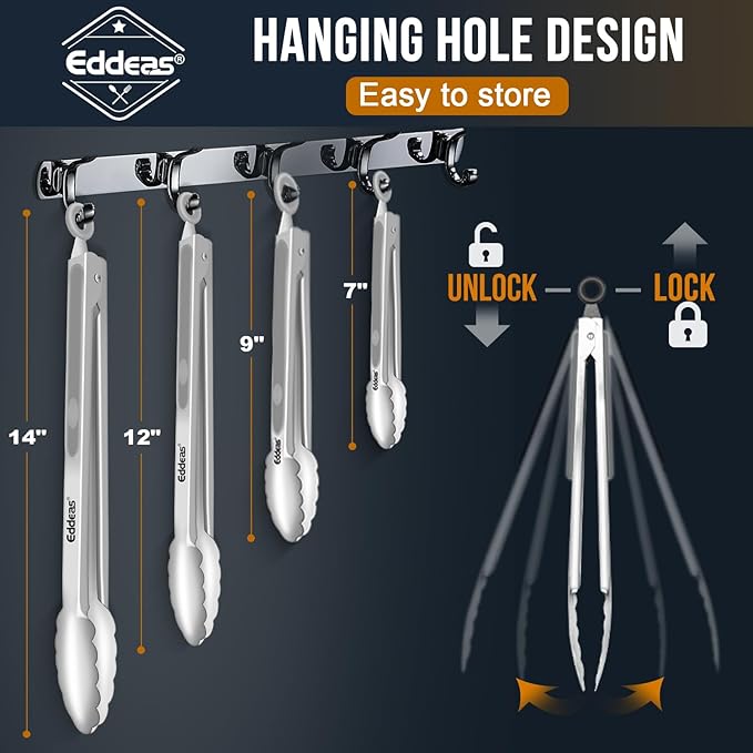 - FOOD GRADE STAINLESS STEEL: Tongs For tongs The heavy duty EDDEAS kitchen tongs built with stainless steel, sturdy, heat resistance, anti-rust, anti-corrosion, light weight, easy to handle like new forever. This tongs for cooking comes with a set of 4, standard 7" Serving Food Tongs 9" cooking tongs 12" and large sized 14" BBQ grill tongs.